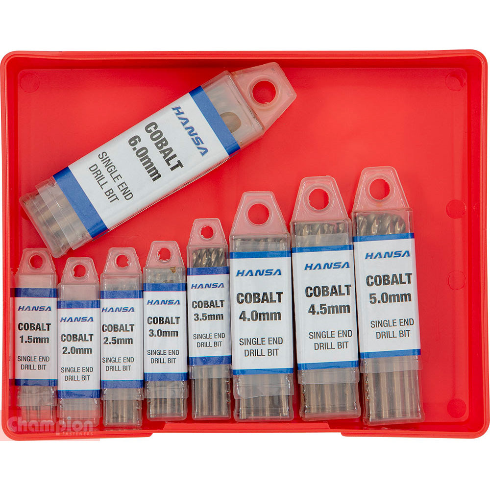 • Metric• Cobalt Steel• Single End• 9 Sizes: 1.5mm to 5mm• 90 Pieces