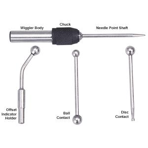 GROZ WRIGGLER / CENTER FINDER Wiggler/Center finder with its four interchangeable attachments is a versatile tool that finds application in many places The attachments can be snapped onto the chuck without removing the collet nut and are clamped by a ball swivel joint which permits adjustment to an angular position With needle point shark working centers can be accurately located. Spring tension on the ball of the point permits guiding the point to true concentricity bringing perfect alignment between the work and machine spindle Wiggler with Ball Contact is useful in locating work by first bringing the ball contact against the work and then indexing it to the desired position relative to the spindle Wiggler with Disc Contact is particularly useful in locating work in confined areas such as slots or shallow holes. Diameter of Disc. 0.1 (2.5mm) Wiggler with Offset Indicator holder is useful for checking run out or concentricity and in checking straightness or alignment of flat surfaces