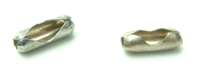 Connectors are used to join ends of ball chain to make a continuous loop such as dog tags, key and identification chains, or to join two lengths of ball chain together. #6 (3.2mm). Chrome on Brass. Box 100.