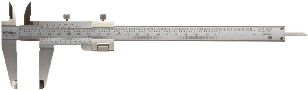 7" / 180mm capacity x .001" / 0.02mm graduations Vernier Caliper Plain basic design Metric and imperial scale Stepped graduation face prevents dust ingress between the main face and slider Includes fine adjustment feature The small vernier face angle (14°) provides easy reading Can measure outside and inside dimensions, depth and steps
