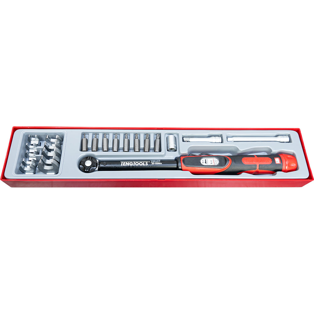 • Set consisting of torque wrench 10 crow foot spannersbit socket 8 TX-bits and extension bars 75 and 125mm.• Individual calibration certificate enclosed. Accuracy ±4%.• Supplied in Teng TTX tray suitable for Teng Tools toolboxes and roller cabinets.