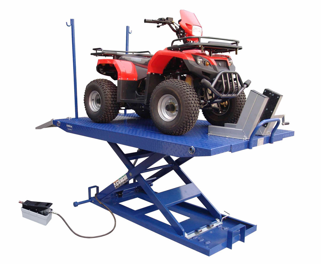 Lift Quad bikes to a comfortable level for maintenance and cleaning. Sturdy steel construction. Made of heavy duty diamond plate, Front Wheelvise included, Professional air hydraulic pump with protection case, Single hydraulic lifting cylinder, Cut-out for easy working on rear wheel, Good for snow mobiles and garden tractors as well.